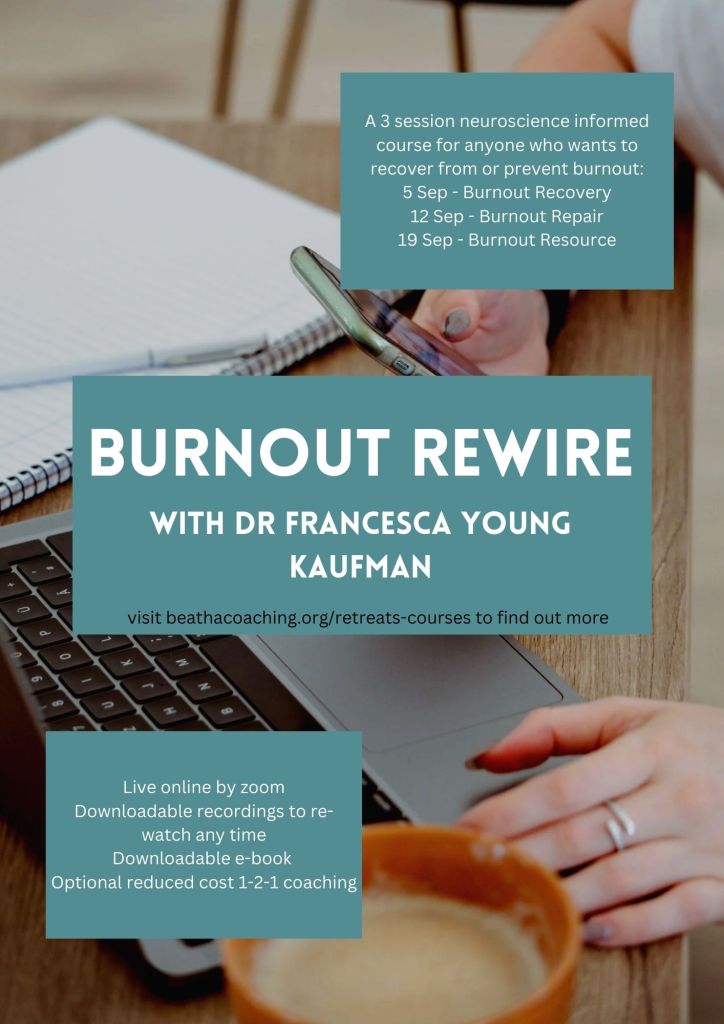 Alternatively, if you have been thinking of joining the Beatha Coaching Community, now is the time to do it – members of the community have full access to the course as well as an archive of past workshops, a monthly group coaching call, and weekly writing sessions. Find out more about the community here, or sign up for Burnout Rewire below: